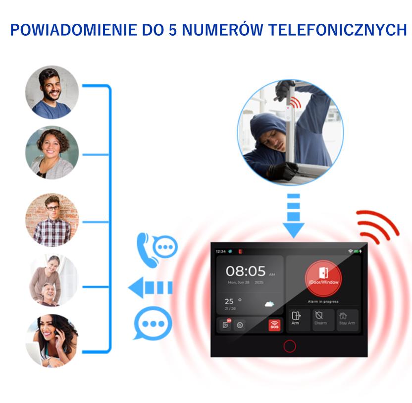 • NOWOŚĆ- Informacja o alarmie poprzez aplikację Tuya Smart/Smart Life, poprzez SMS-a, poprzez połączenie telefoniczne,